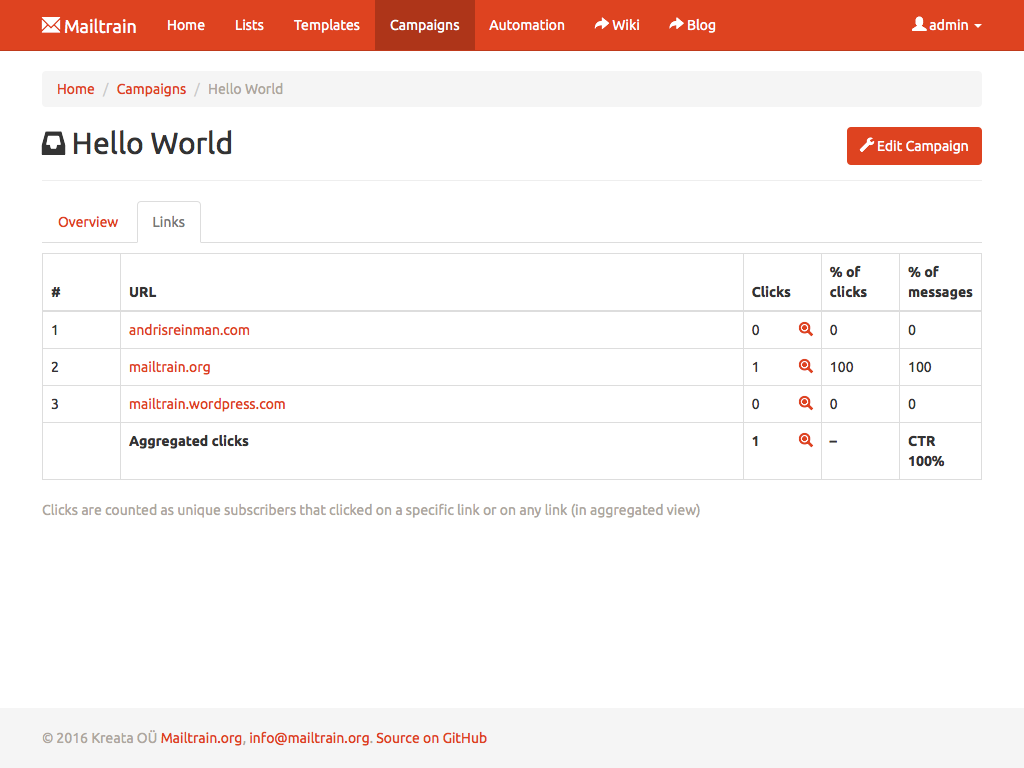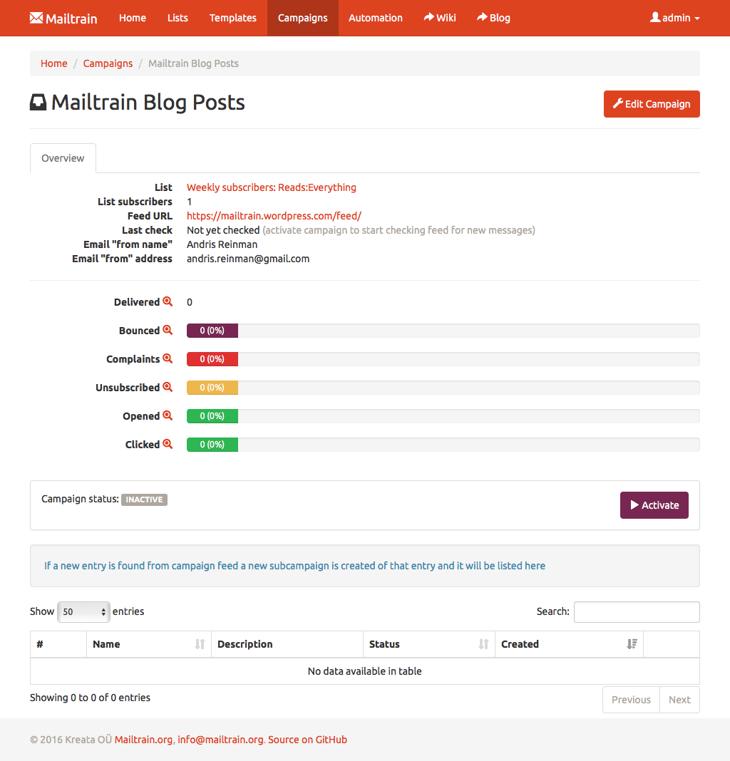 Setup Mailtrain to track RSS feeds and if a new entry is detected in a feed then Mailtrain auto-generates a new campaign using entry data as message contents and sends it to selected subscribers.