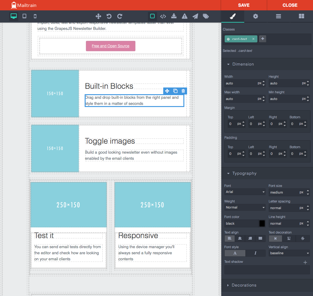 Mailtrain ships with GrapeJS and Mosaico built in, two advanced template editors. Mailtrain also offers a code editor if you prefer to handcraft the HTML yourself.